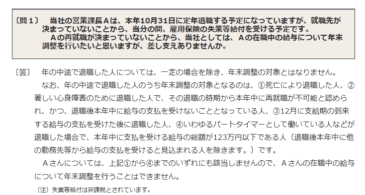 また、年の途中に退職した人で上記①~④に該当する人についてはその退職の時に年末調整を行って下さい。