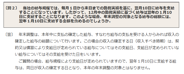 年末調整の対象となる給与は本年中に支給日が到来して支払いの確定した給与となります。
