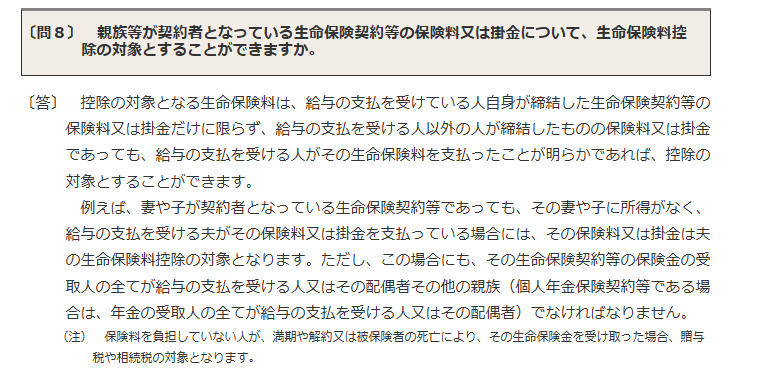 注意書きにある通り、契約者と掛金の負担者が違う場合、贈与や相続といった問題が生じますので、契約者と保険料負担者は一致させるのが望ましいです。