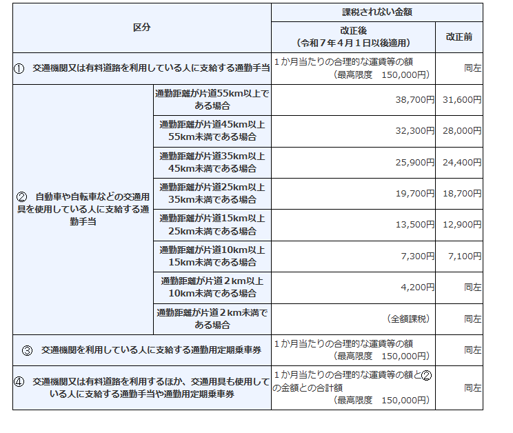 この改正は令和7年(2025年)4月1日以後に受けるべき通勤手当について適用されます。